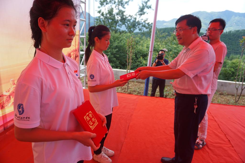 学院党委书记许云代表学院党委和全体教职工向蜡烛山村的父老乡亲们致以诚挚的问候,向受到表彰的优秀社会实践队员表示热烈的祝贺,他充分肯定了“蜡烛情 青春梦”暑期“三下乡”社会实践队在助力帮扶村脱贫攻坚实践活动中取得的丰硕成效,并勉励同学们继续巩固成绩、再接再厉,以襄汽学子的担当奉献和争先创优的精神面貌不断彰显学院实践育人特色。院长耿保荃为获得表彰的优秀实践队员颁发了荣誉证书。