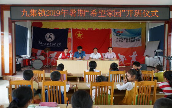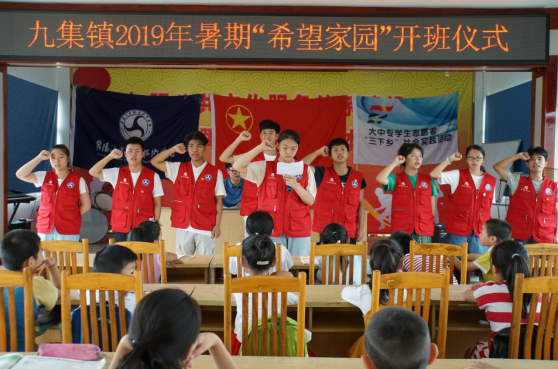 开班仪式由九集镇团委副书记吴珊珊主持,九集镇文化体育服务中心主任张瑞致欢迎词,同时表示将为“希望家园”活动提供后勤保障和鼎力支持。随后,社会实践队队长鲁正韬做表态发言,并表示将发扬不怕困难、不怕吃苦的精神,力求为留守儿童带来更多的知识,用自己的行动让他们度过一个愉快的暑期。最后全体队员进行集体宣誓。