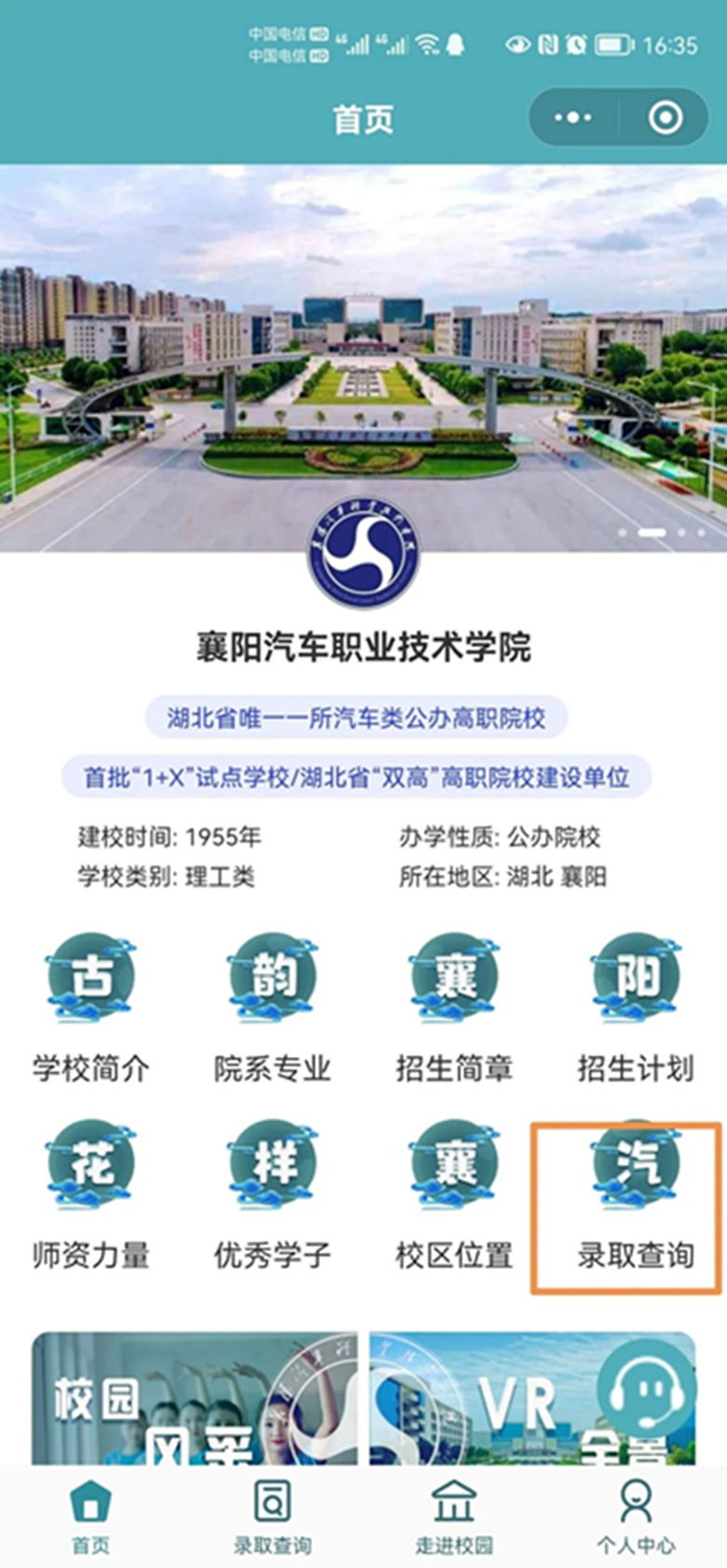 2、进入微信小程序,搜索“襄阳汽车职业技术学院”,或扫描此二维码进行录取查询。