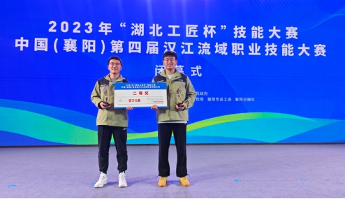 2023年10月17日,由智能制造学院工业机器人技术专业2201班学生李秉杰、张国豪组成的竞赛团队在湖北省人力资源与社会保障厅举办的2023年“湖北工匠杯”技能大赛—中国(襄阳)第四届汉江流域职业技能大赛中,经过激烈角逐,荣获团队二等奖。在领奖台上,青春的光芒照射四方,他们用自已的双手让青春闪闪发光。
