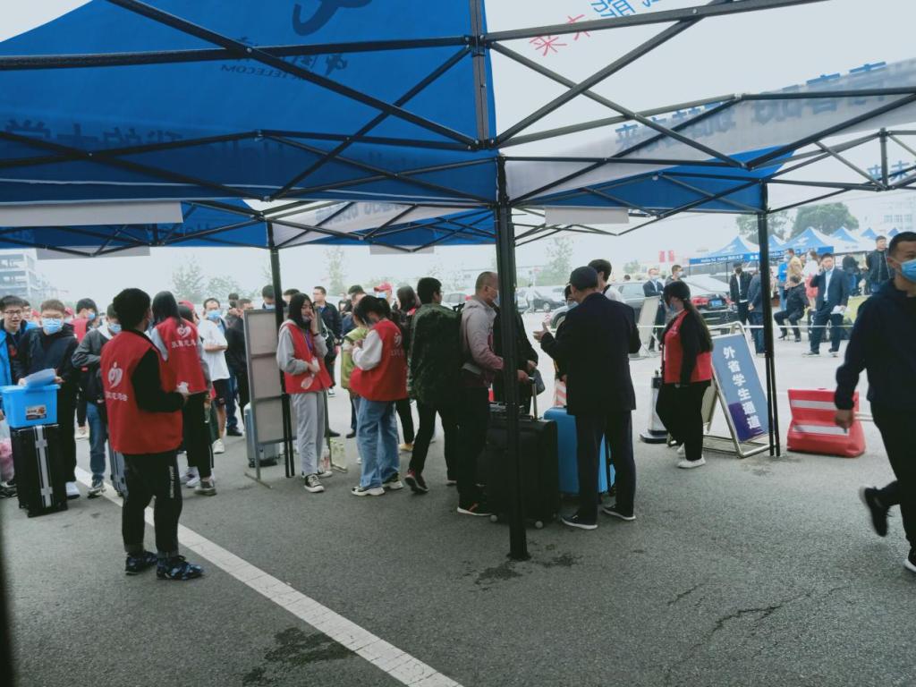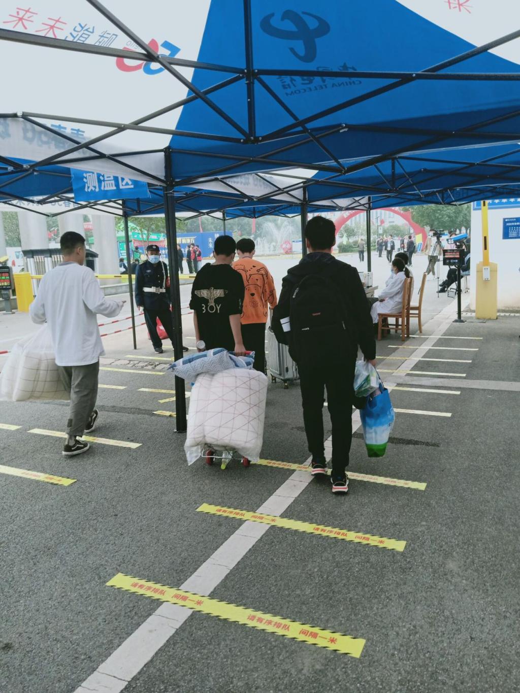 学生由学校大门口进入,设置了入校专属通道和临时等候区。入校学生需保持1米的安全距离排队,接受体温检测、行李消杀,出示健康码后方可进入。