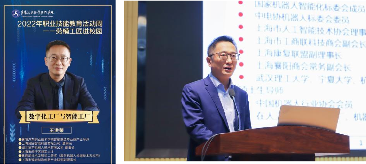 今年职业教育活动周是新修订的《职业教育法》正式施行后的第一个活动周,为深入贯彻2022年“职业教育活动周”的精神,弘扬劳模精神,拓展学生视野,5月9日,我校特邀请上海贽匠智能科技有限公司、湖北贽丰机器人技术有限公司董事长、襄阳汽车职业技术学院智能制造专业群产业导师王洪荣,开展了《数字化工厂与智能工厂》专题讲座。