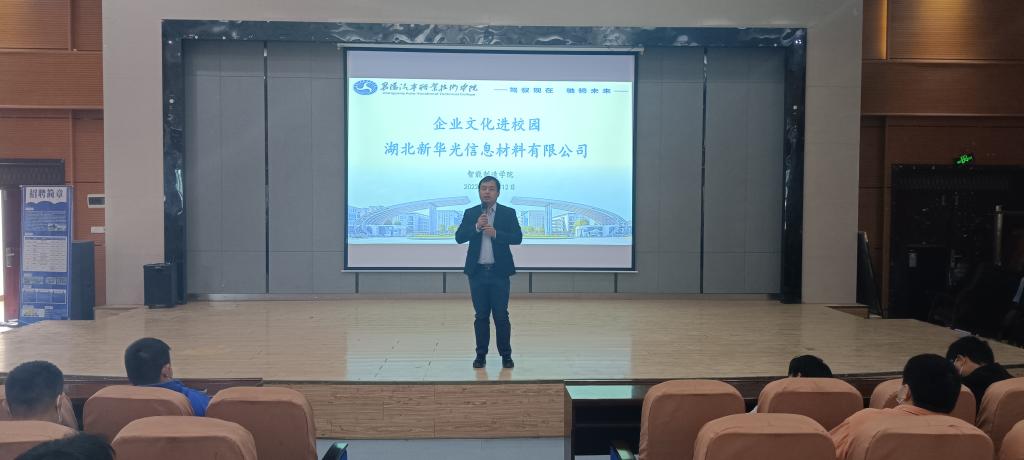 2022年10月12日湖北新华光信息材料有限公司人力资源部负责人陈总等一行人来我院开展企业文化进校园活动,给全体学生开展了一堂丰富多彩的讲座。