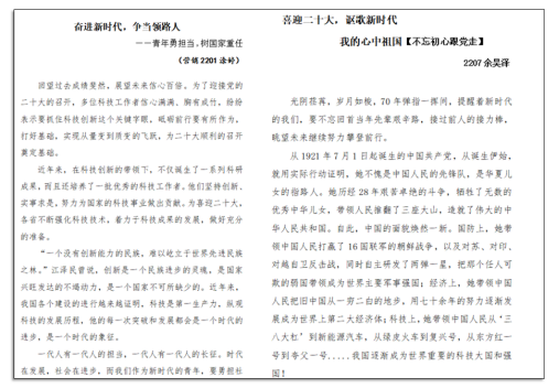 此次征文大赛历时半个月,同学们参与积极,广泛来稿,来稿文章中同学们用个人的亲身经历表达了对祖国的热爱,并以个人独特视角阐述对党二十大会议精神的理解;同时也呼吁广大同学从自身做起,奋发图强,合理规划自己的学习时间,积极投身于社会的奉献中、国家的建设中,不负这韶华岁月。