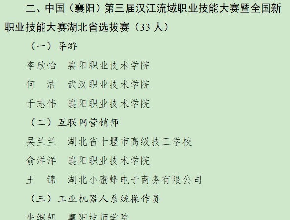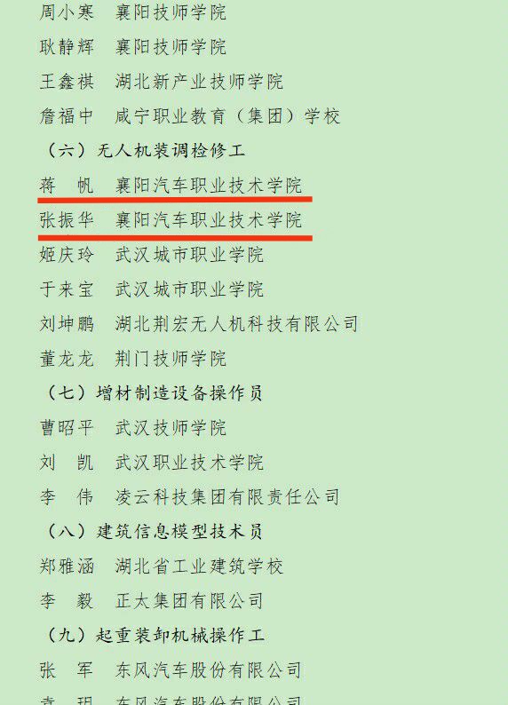韦振玲于2022年5月参加襄阳市中职技能大赛CAD项目教师组比赛获一等奖(第一名),并于2022年12月获襄阳市事业单位工作人员记功奖励;蒋帆、张振华于2021年参加“湖北工匠杯”技能大赛——中国(襄阳)第三届汉江流域职业技能大赛、全国新职业技能大赛湖北省选拔赛暨第一届“襄十随神”城市群职业技能大赛,获无人机装调与检修赛项一等奖。两人同时还获得2021年度“湖北工匠杯”职业技能竞赛湖北省技术能手称号。