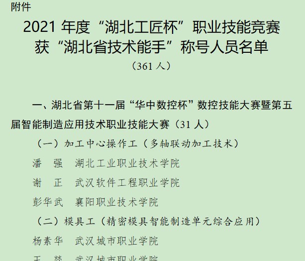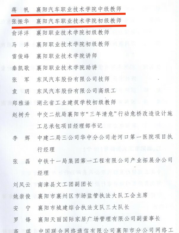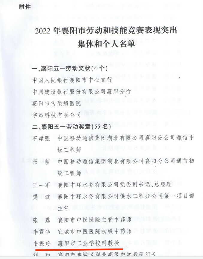 近日襄阳市总工会发布“关于表扬2022年全市劳动和技能竞赛中表现突出集体与个人的通报”名单中,襄阳汽车职业技术学院智能制造学院韦振玲、蒋帆、张振华三位老师获得襄阳五一劳动奖章。