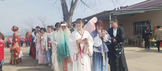 日日春光斗日光,山城斜路杏花香。伴随着明媚的春光,2023年3月8日,交管学院华忆阁汉服社与学生会志愿者们参与了“白云村第一届杏花节”。