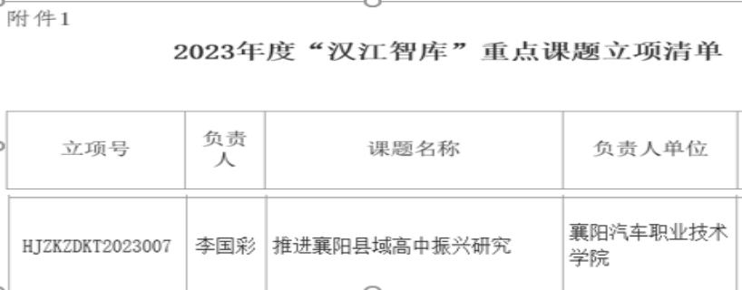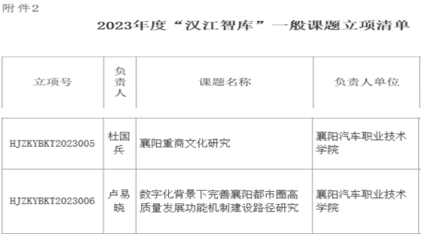 交通运输现代管理学院李国彩主持的《推进襄阳县域高中振兴研究》被作为重点课题立项,杜国兵主持的《襄阳重商文化研究》、卢易晓主持的《数字化背景下完善襄阳都市圈高质量发展功能机制建设路径研究》被作为一般课题立项。