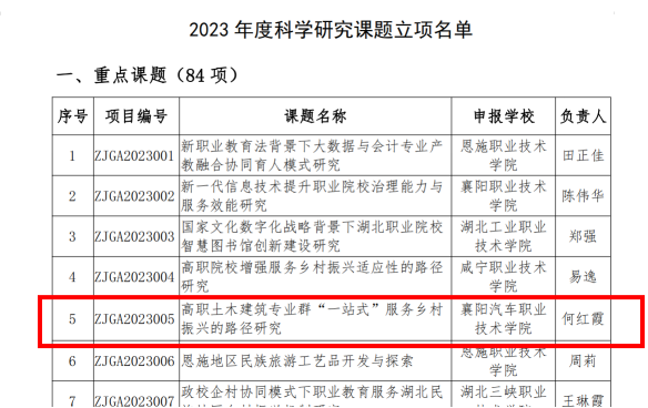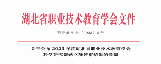 6月7日,2023年度湖北省职业技术教育学会科学研究课题立项评审结果公示,我院院长何红霞主持申报的《高职土木建筑专业群“一站式”服务乡村振兴的路径研究》课题获批立项。