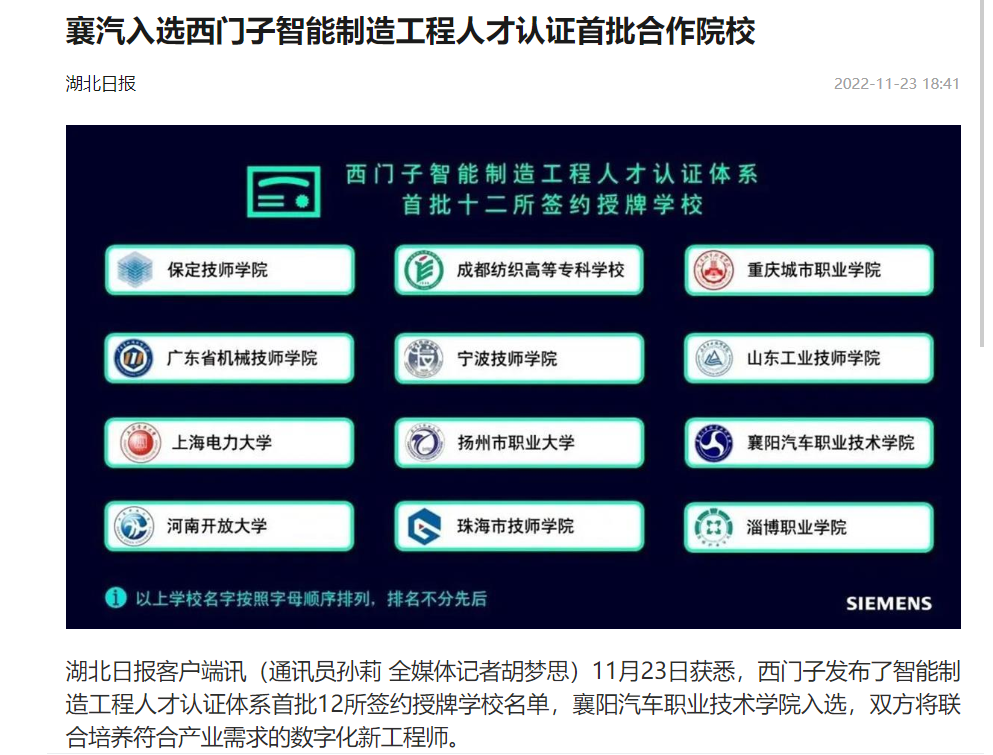 湖北日报客户端讯(通讯员孙莉 全媒体记者胡梦思)11月23日获悉,西门子发布了智能制造工程人才认证体系首批12所签约授牌学校名单,襄阳汽车职业技术学院入选,双方将联合培养符合产业需求的数字化新工程师。