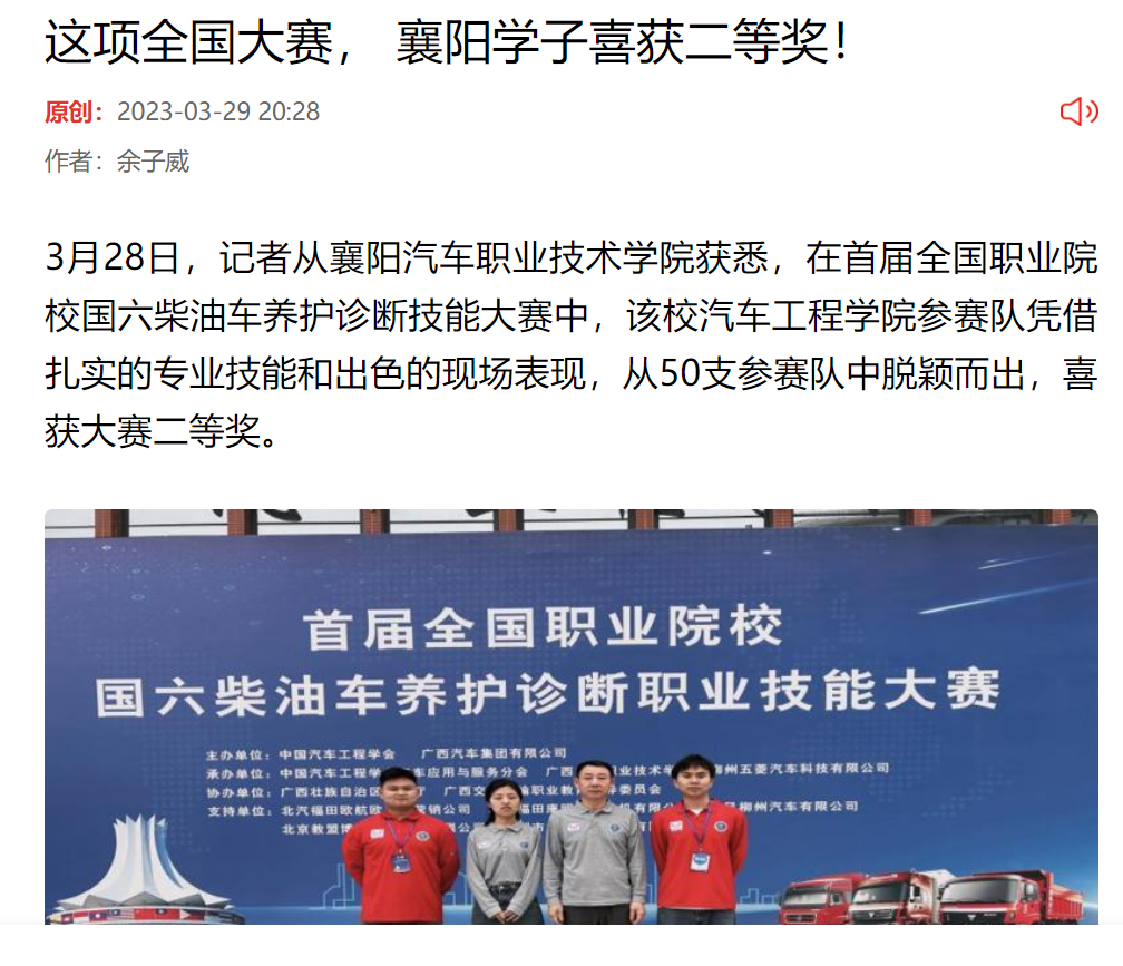 3月28日,记者从襄阳汽车职业技术学院获悉,在首届全国职业院校国六柴油车养护诊断技能大赛中,该校汽车工程学院参赛队凭借扎实的专业技能和出色的现场表现,从50支参赛队中脱颖而出,喜获大赛二等奖。