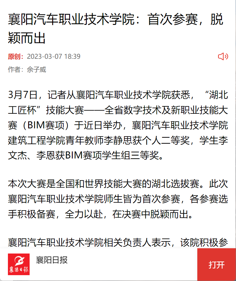 3月7日,记者从襄阳汽车职业技术学院获悉,“湖北工匠杯”技能大赛——全省数字技术及新职业技能大赛(BIM赛项)于近日举办,襄阳汽车职业技术学院建筑工程学院青年教师李静思获个人二等奖,学生李文杰、李恩获BIM赛项学生组三等奖。
