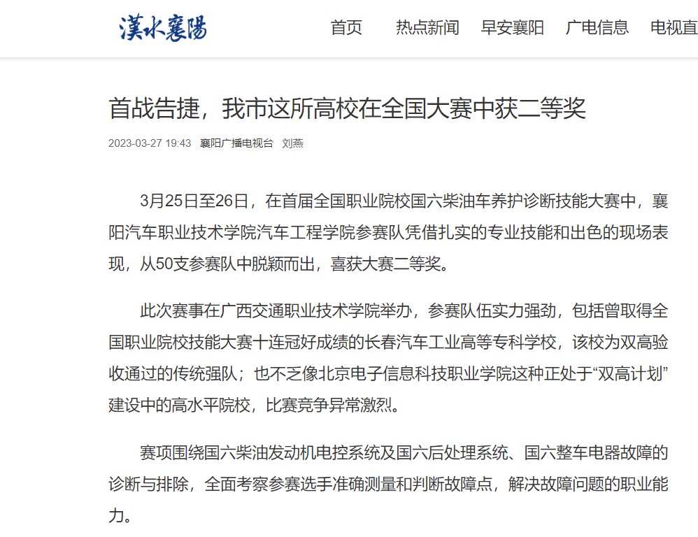 3月25日至26日,在首届全国职业院校国六柴油车养护诊断技能大赛中,襄阳汽车职业技术学院汽车工程学院参赛队凭借扎实的专业技能和出色的现场表现,从50支参赛队中脱颖而出,喜获大赛二等奖。