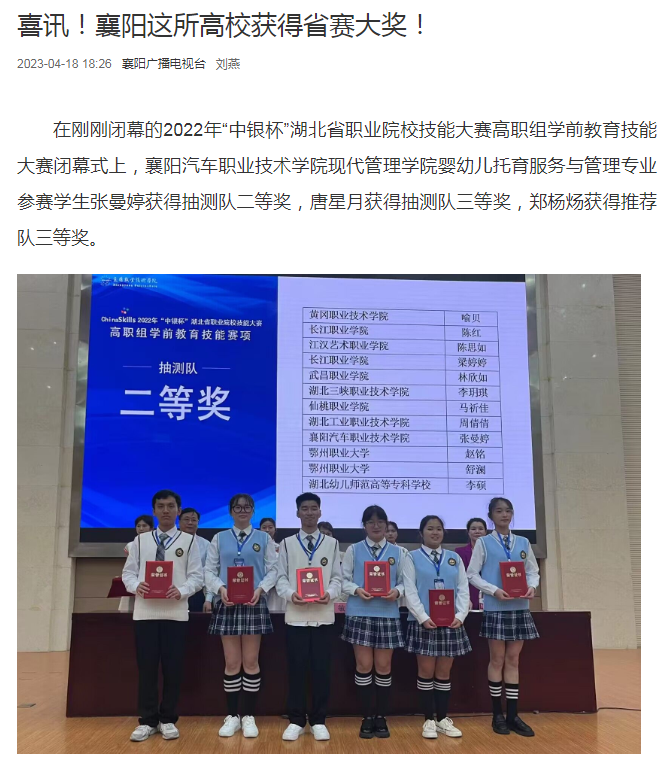 在刚刚闭幕的2022年“中银杯”湖北省职业院校技能大赛高职组学前教育技能大赛闭幕式上,襄阳汽车职业技术学院现代管理学院婴幼儿托育服务与管理专业参赛学生张曼婷获得抽测队二等奖,唐星月获得抽测队三等奖,郑杨炀获得推荐队三等奖。