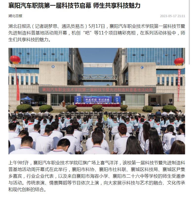 湖北日报讯(记者胡梦思、通讯员易杰)5月17日,襄阳汽车职业技术学院第一届科技节暨先进制造科普基地活动周开幕,机创“吧”等11个项目精彩亮相,在系列活动体验中,师生们共享科技的魅力。
