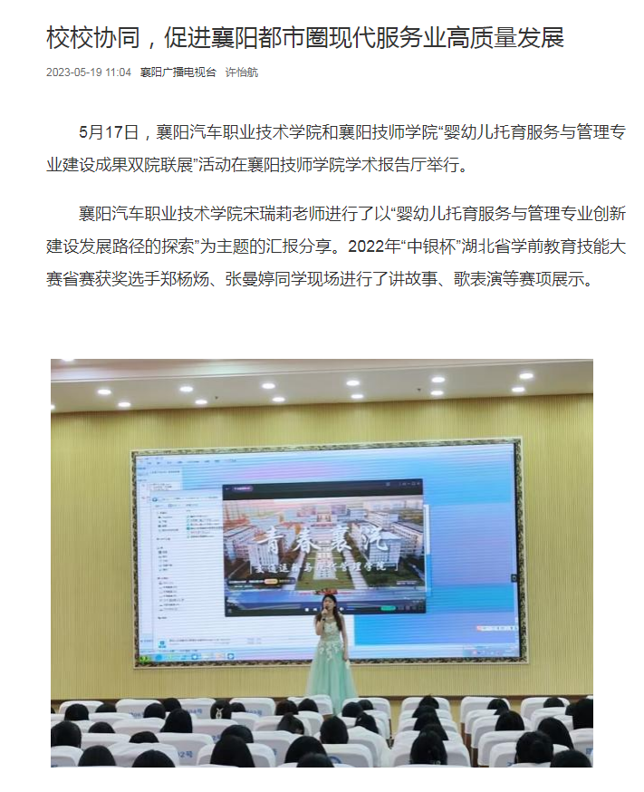 5月17日,襄阳汽车职业技术学院和襄阳技师学院“婴幼儿托育服务与管理专业建设成果双院联展”活动在襄阳技师学院学术报告厅举行。