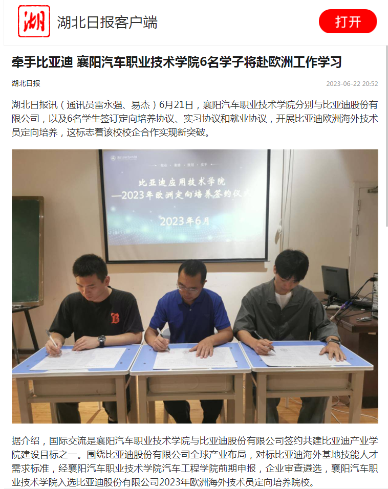 湖北日报讯(通讯员雷永强、易杰)6月21日,襄阳汽车职业技术学院分别与比亚迪股份有限公司,以及6名学生签订定向培养协议、实习协议和就业协议,开展比亚迪欧洲海外技术员定向培养,这标志着该校校企合作实现新突破。
