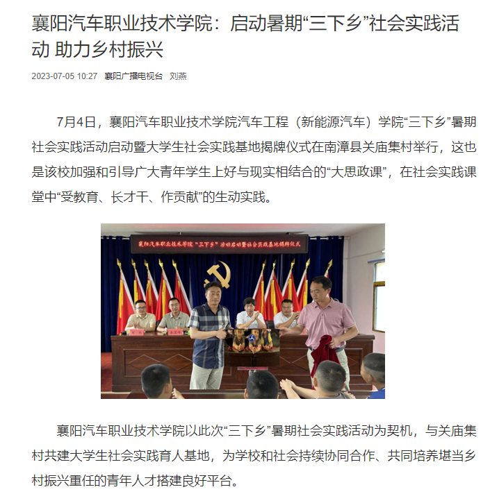 7月4日,襄阳汽车职业技术学院汽车工程(新能源汽车)学院“三下乡”暑期社会实践活动启动暨大学生社会实践基地揭牌仪式在南漳县关庙集村举行,这也是该校加强和引导广大青年学生上好与现实相结合的“大思政课”,在社会实践课堂中“受教育、长才干、作贡献”的生动实践。