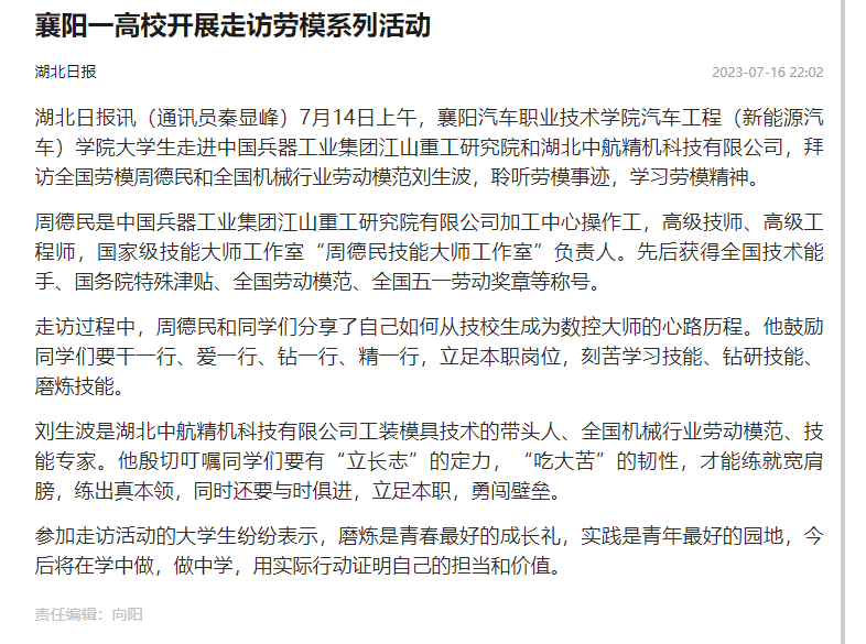 湖北日报讯(通讯员秦显峰)7月14日上午,襄阳汽车职业技术学院汽车工程(新能源汽车)学院大学生走进中国兵器工业集团江山重工研究院和湖北中航精机科技有限公司,拜访全国劳模周德民和全国机械行业劳动模范刘生波,聆听劳模事迹,学习劳模精神。