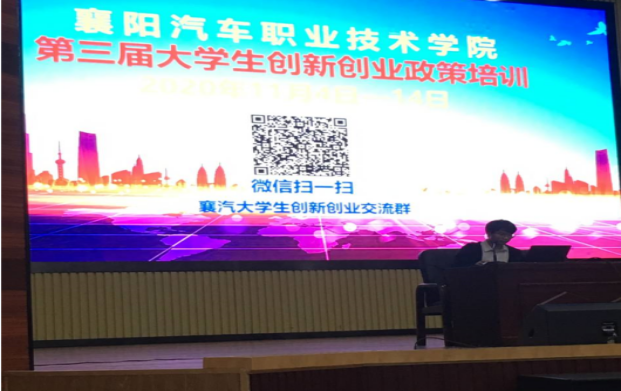职教周期间,为进一步促进大学生创新创业适应就业需要,提高大学生“双创”意识,了解创业政策,由产学研工作处主办,襄汽科技园承办的“第三届大学生创新创业政策培训”于2020年11月10日-13日晚在图书馆一楼科学会堂成功举行。
